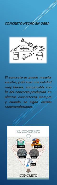 Para lograr buenas mezclas de concreto en obra, que requieran volúmenes considerablemente pequeños de concreto, no necesariamente se requiere de concreto premezclado. El concreto hecho en obra es el de mayor empleo en la edificación y vivienda, sin embargo, pocos cuidan el proceso para asegurar la calidad.