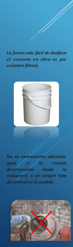 Cuarto: La medición de los materiales es muy importante. Se debe procurar utilizar recipientes del mismo volumen, por ejemplo, botes de 19 litros. y en el caso del agua, debe existir uno exclusivo para ella, con una marca que indique el volumen especificado. Este recipiente debe mantenerse limpio y no tener fisuras.