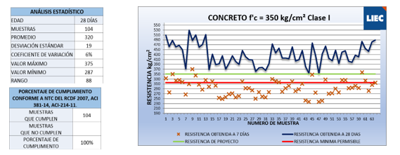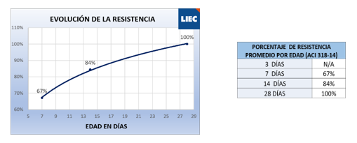 En el caso del concreto, muestra las resistencias obtenidas a primera y última edad de ensaye de cada espécimen junto con las tolerancias que indican las normas. Se obtienen algunos datos interesantes como es el promedio y la desviación estándar. Un valor bajo de desviación estándar indica que el proceso de fabricación del concreto está muy controlado y uno alto indica lo contrario.