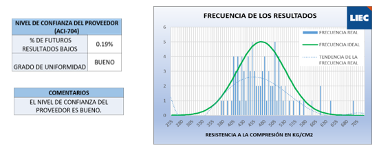 Por otro lado, la campana de Gauss es la representación gráfica de la distribución normal de las resistencias obtenidas, se reparten en valores bajos, medios y altos, creando un gráfico de forma acampanada y simétrica con respecto al promedio, dependiendo de la desviación estándar la campana tiene mayor o menor amplitud. Nos ayuda a poder determinar el nivel de confianza del proveedor.