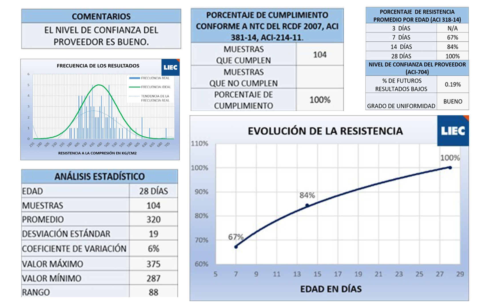 En el caso del concreto, muestra las resistencias obtenidas a primera y última edad de ensaye de cada espécimen junto con las tolerancias que indican las normas...